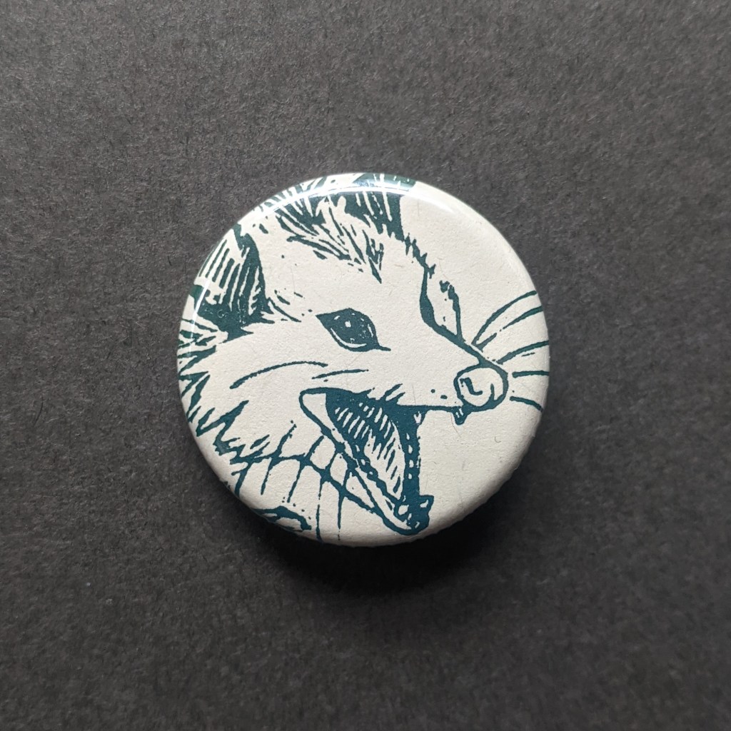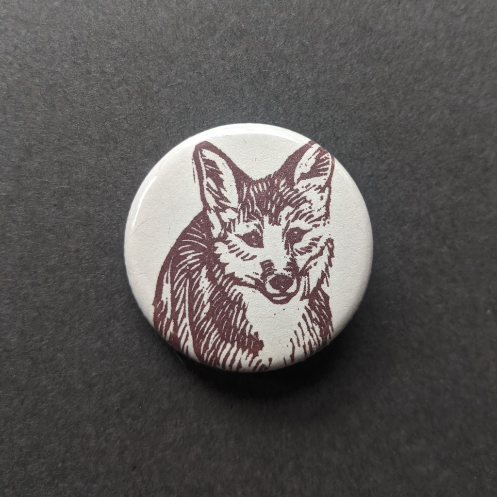 Each of these 1.25″ (3.2 cm) pinback buttons is individually hand stamped with one or two of my carved stamps. A lot of these stamps I’ve made over the years happen to fit within these parameters, and some I’ve carved specifically for buttons. Some are stamped from sections of blocks I’ve used to make editioned prints. Even though they are small tokens easily given away, I try to get the best print as I would in my regular printmaking practice.